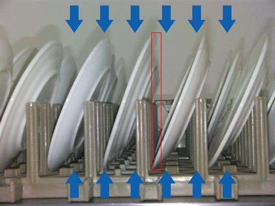 最關(guān)鍵的是斜插式的洗碗機(jī)傳送,在洗碗機(jī)清洗過(guò)程中存在較大的弊端,斜插于籃筐(傳送帶)上會(huì)因?yàn)槠浔旧淼男螤钤斐梢粋€(gè)清洗死角,導(dǎo)致餐具清洗不干凈。如下圖示。所以在業(yè)內(nèi)不公開(kāi)的秘密,因清洗質(zhì)量存在缺陷,用在不太重要的客戶(hù)場(chǎng)所,象重要的機(jī)關(guān)、大型學(xué)院、合資公司、高級(jí)酒店等已逐步不再采用。