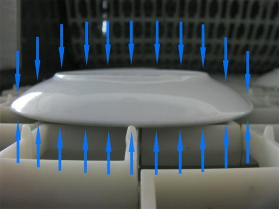 平放式洗碗機清洗時餐具直接口朝下放置于洗碗機傳送帶上,清洗時高壓水直接均勻噴洗餐具背面與餐具內部,只要擺放時餐具不重疊就不會產生清洗死角。并且可以直接清洗允許高度的碗框或箱子。