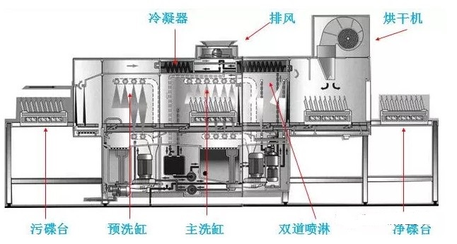 主洗的目的是清除餐具表面的油污,循環(huán)水反復噴射,水溫在55℃左右;