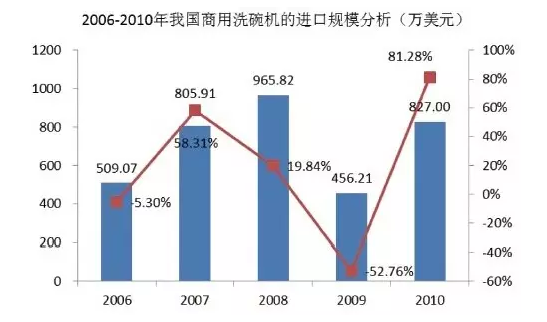 2006年我國商用洗碗機的進口金額為509.07萬美元,同比下降5.3%,2007年上升為805.91萬美元,同比增長幅度達到58.31%,2008年達到965.82萬美元,同比增長率達到19.84%,受金融危機影響,進口金額規模下降為456.21萬美元,下降幅度達到52.76%,2010年經濟開始復蘇,我國商用洗碗機的進口規模達到827萬美元,同比增長81.28%。