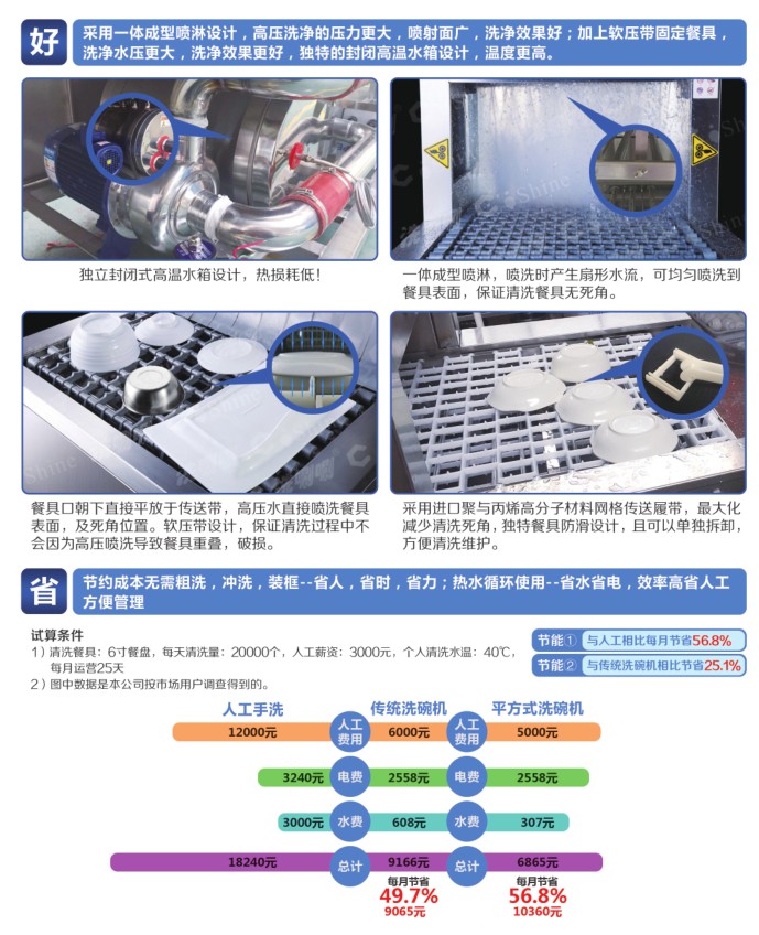 第二:是洗碗機(jī)浪費(fèi)水電的問題,大多數(shù)人認(rèn)為用洗碗機(jī)洗更費(fèi)電費(fèi)水,但是國(guó)家家用電器質(zhì)量監(jiān)督檢驗(yàn)中心曾組織了一場(chǎng)用洗碗機(jī)洗碗以及人工洗碗的耗用水電對(duì)比實(shí)驗(yàn),兩組分別清洗76件污染程度、大小一樣的餐具,比較用水量、用電